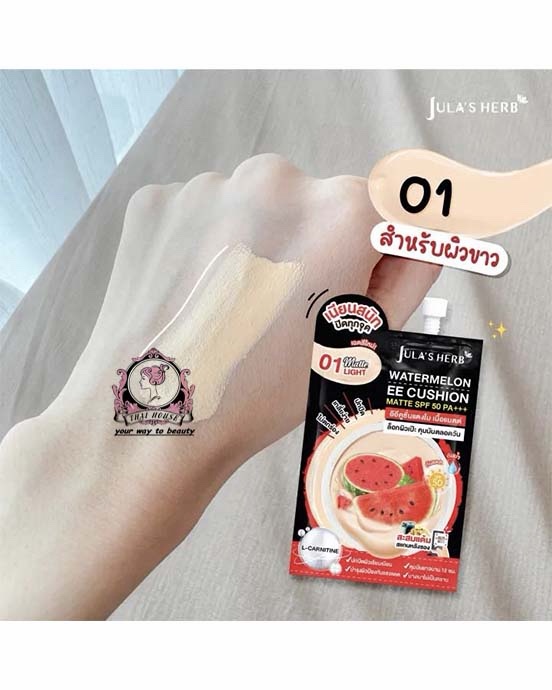 Jula’s Herb Watermelon EE Cushion Matte SPF50 PA+++ in shade 01 Matte Light offers oil control, pore-blurring matte coverage, and high sun protection with a lightweight long-lasting formula