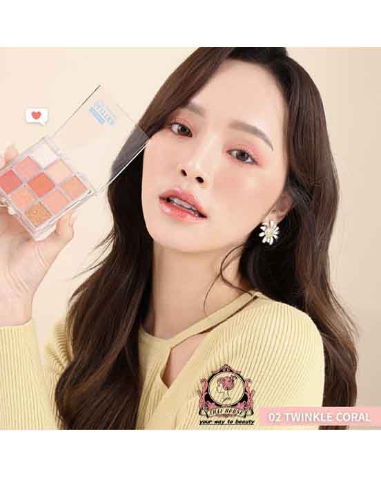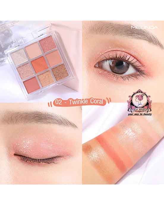 MEILINDA Glitter Shot Shadow Palette 02 Twinkle Coral features 9 warm coral and peach shades in matte and glitter finishes—blendable, buildable color for everyday to glam eye looks.