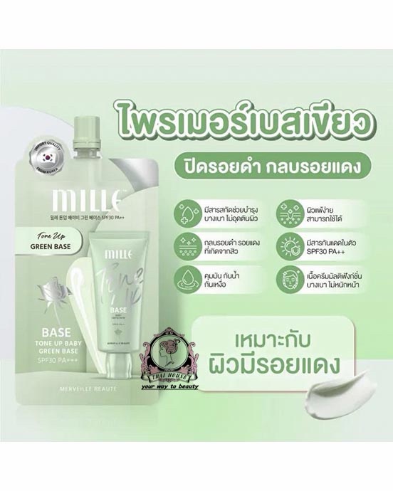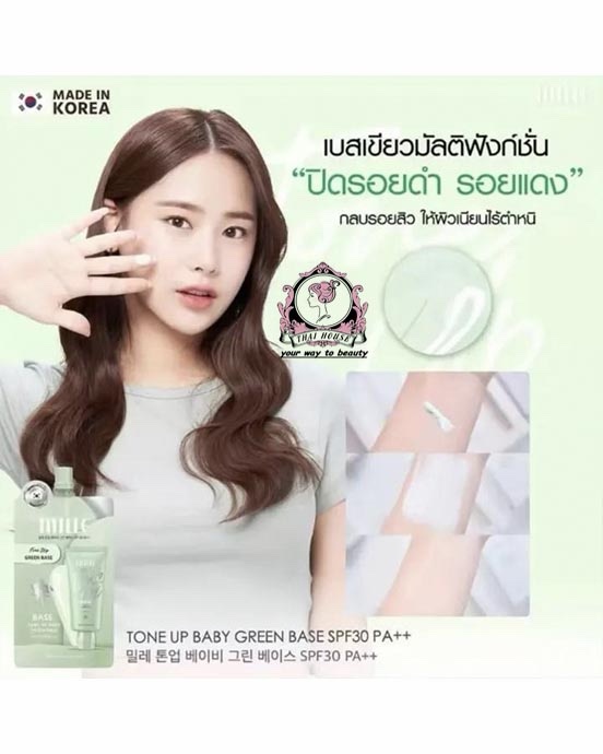 Mille Tone Up Baby Green Base SPF30 PA++—a Korean color-correcting primer that neutralizes redness, blurs pores, and delivers a soft tone-up finish while helping protect skin from UVA/UVB. Lightweight, non-greasy, and perfect under makeup or on its own.