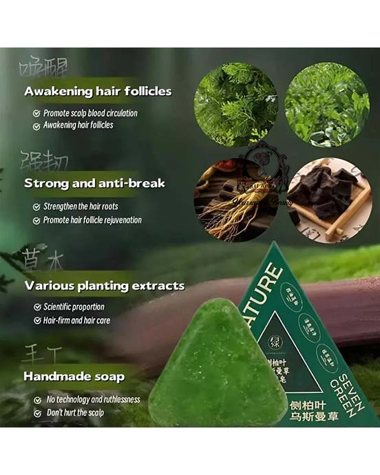 Experience the natural power of Seven Green Nature Shampoo Bar, formulated with Cacumen Biotae and Isatis Indigotica to cleanse and revitalize your hair. This handmade soap bar is designed to strengthen hair roots, awaken follicles, and promote overall hair health.