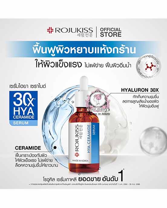 ROJUKISS HYA Ceramide Serum delivers deep hydration and barrier repair with Hyaluronic Acid and Ceramides. Skin looks plump, smooth, and glowy while dryness and tightness are reduced. Lightweight, non-sticky texture—Made in Korea.