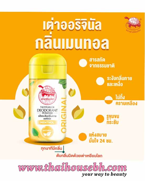 TAOYEABLOK Original Menthol Deodorant Powder helps absorb sweat and control odor for a fresh feeling. Its natural formula with menthol provides a cooling sensation. Suitable for all skin types.