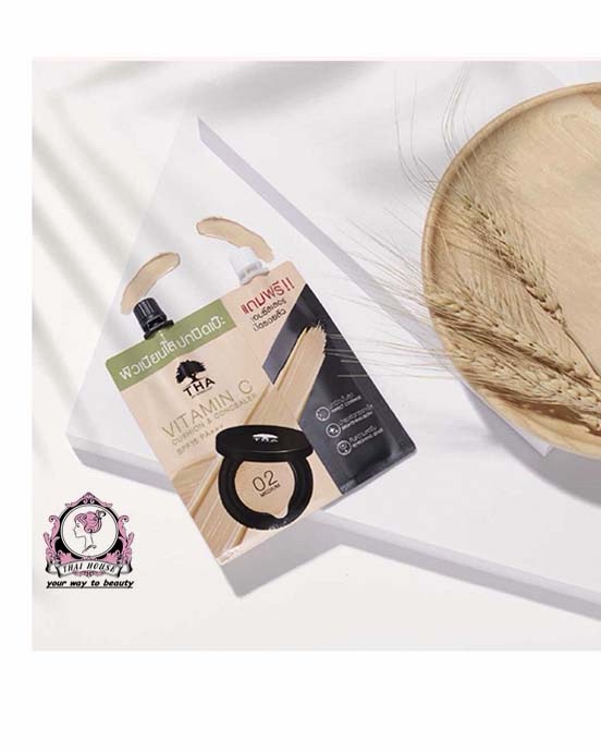 THA Vitamin C Cushion & Concealer SPF15 PA+++ (02 Medium) delivers bright, natural coverage with built-in concealer and daily UV protection in a travel-friendly sachet.
