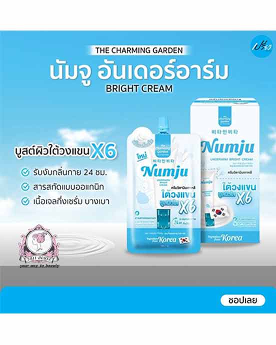Numju Underarm Bright Cream (sachet) helps brighten dark underarms, reduce the look of spots, and keep skin smooth, soft and fresh. Lightweight, non-sticky texture for daily deodorizing care—Made in Korea.